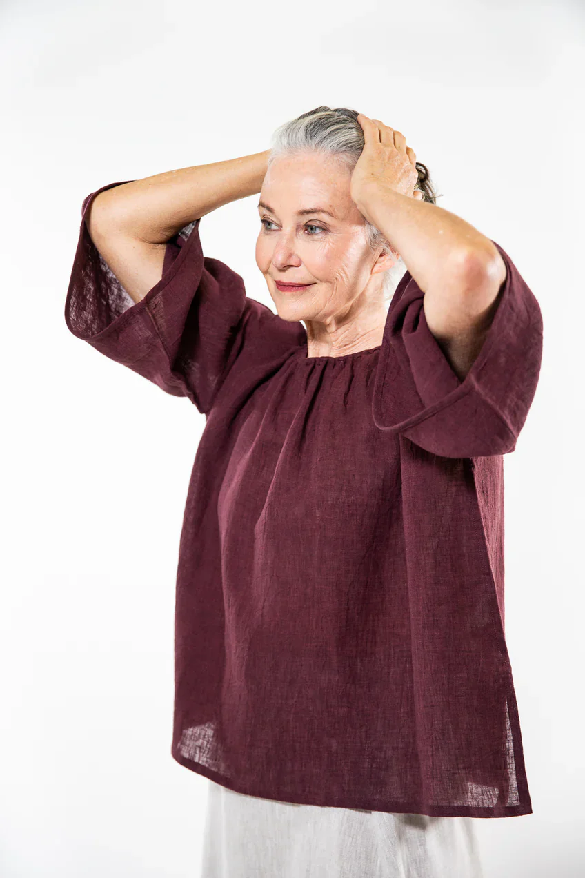 The Beatrice Top is a great go-to boxy cut top with a flattering bell sleeve that sits just below the elbow and is finished with a binding edge. The neckline is gently gathered with soft elastication, and side splits allow ease of movement.