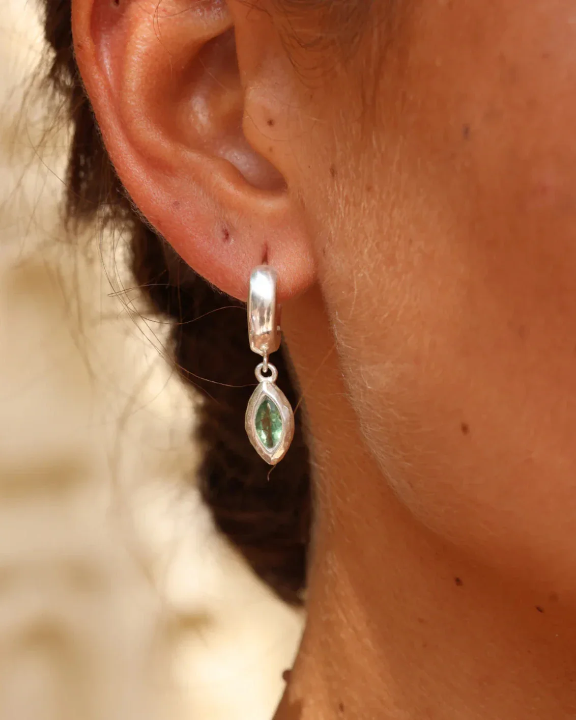 The Tonimay Belle Huggies are the baby version of our Isabella Marquise Earrings. They are a stunning single marquise stone drop huggies set available in either Moonstone or Apatite. The hand cut stones are bezel set with a delicately hammered finish.Â