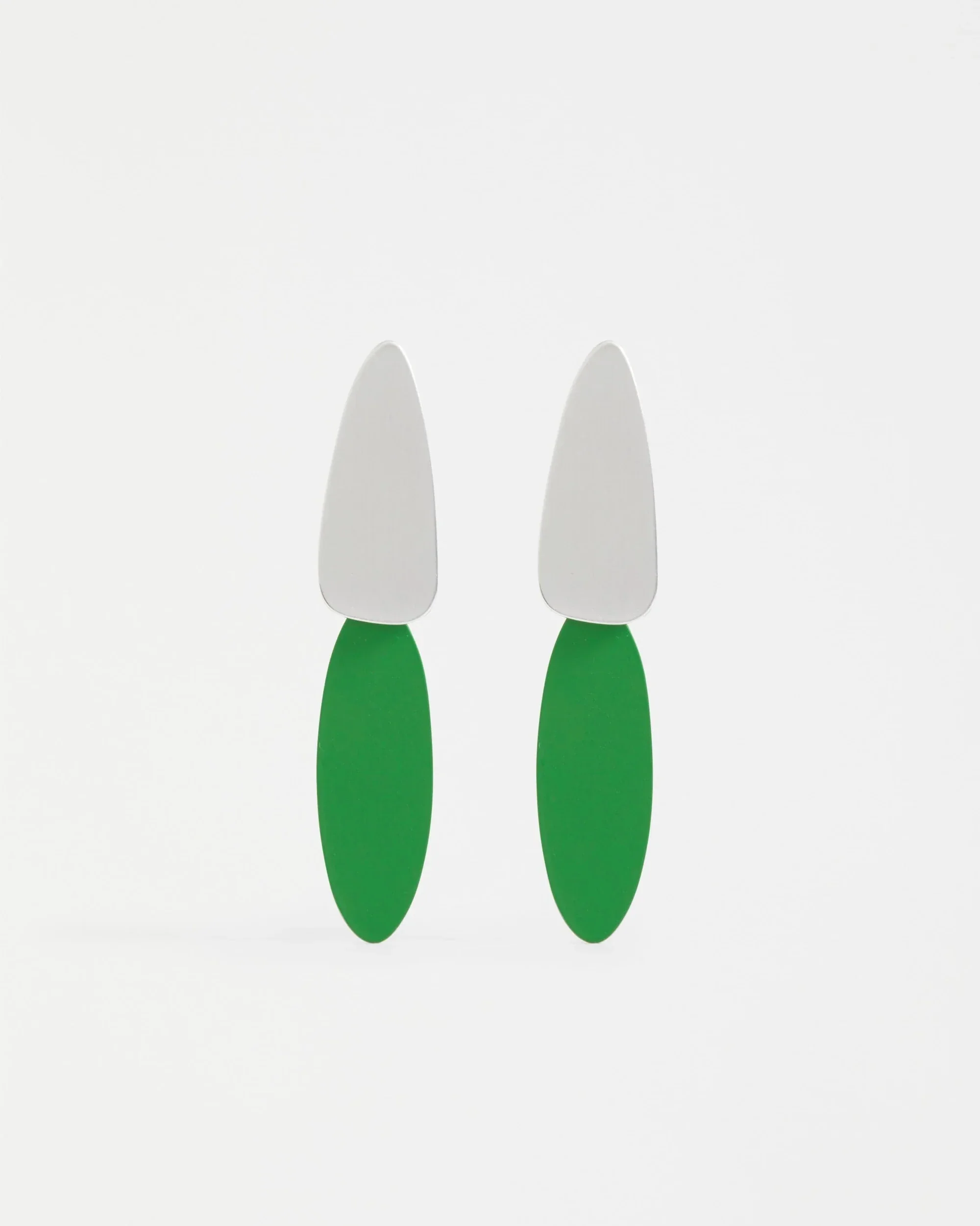 The Finn Long Drop Earring features two long, rounded shapes which contrast against one another in opposing finishes. The top component shines with its brushed metal lustre, whilst the bottom piece contrasts in vibrant rubberised metal. These earrings have standard titanium posts accompanied by brass butterfly backings.