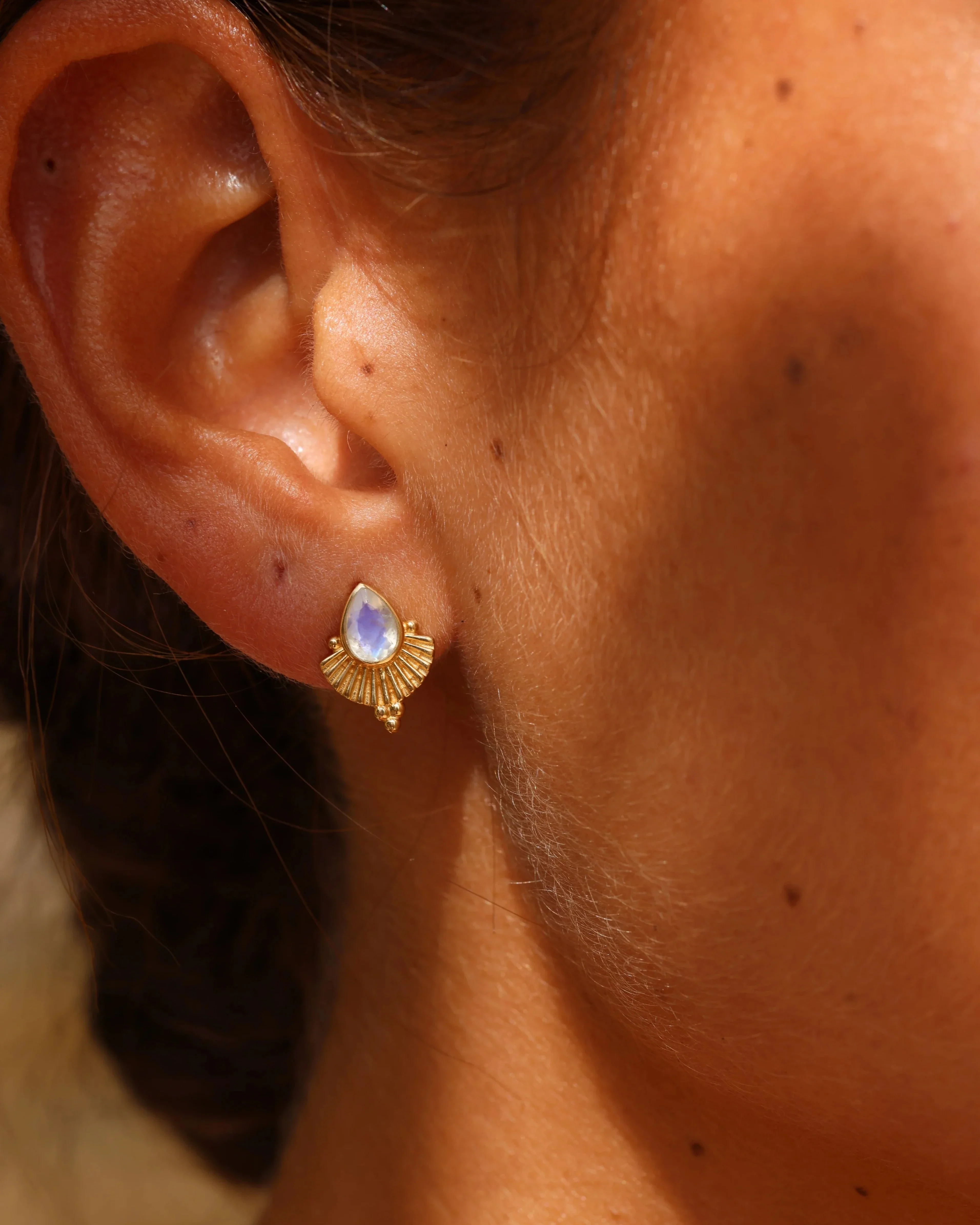 The Tonimay Venus Earrings are the new and improved version of our classic Cleopatra Earrings. A more refined look, the Venus studs incorporate a faceted natural stone and sit delicately on the ear. The perfect every day stud! This style is available in Iolite, Rhodolite, Apatite and Moonstone.